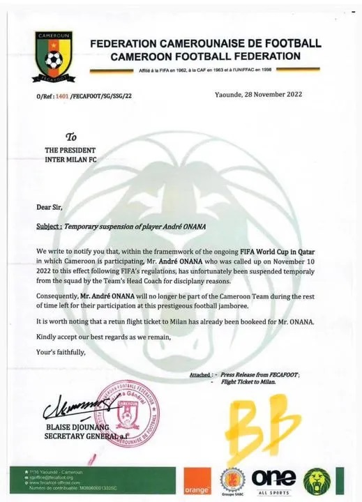 La FeCaFoot, Federcalcio del Camerun, ha inviato nella giornata di ieri una lettera con destinatario il presidente dell'Inter Steven Zhang, nella quale si dava comunicazione della sospensione del portiere André Onana per motivi disciplinari, prima che quest'ultimo abbandonasse quest'oggi il Qatar. Nella lettera, firmata dal segretario generale Blaise Djounang, viene specificato che l'ente si è preoccupato di riservare un biglietto per Milano per il suo giocatore, presente in allegato.