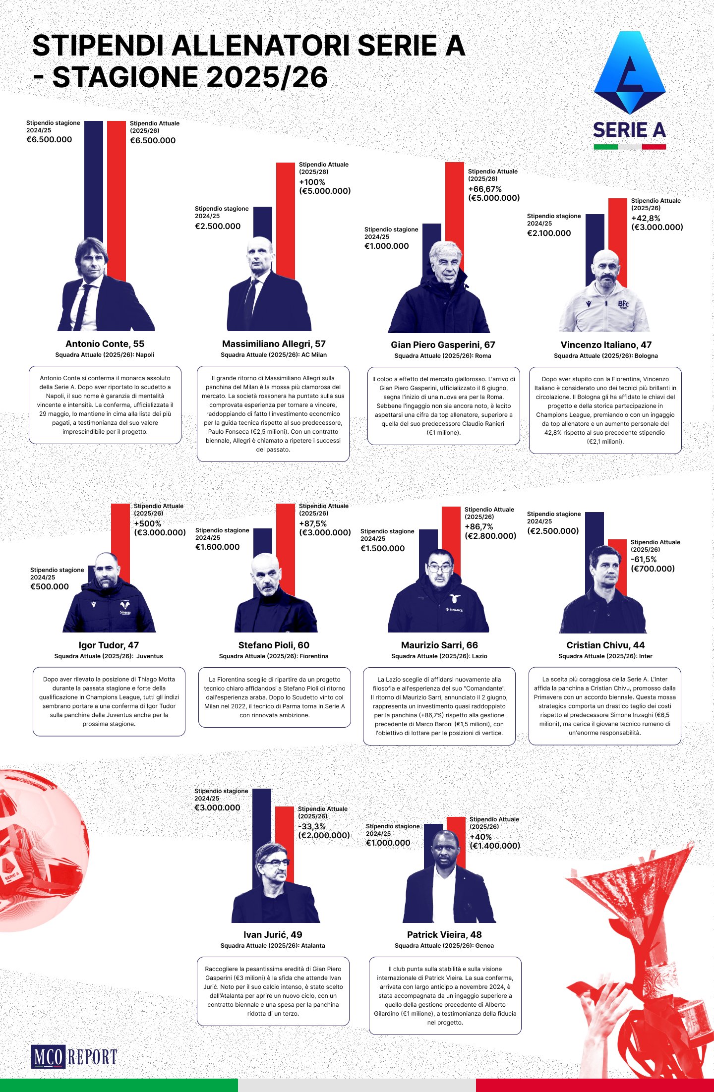 Le novità in panchina comportano anche adeguamenti economici (come sottolineato da MCO Report), e se Conte si conferma l'allenatore più pagato con €6 milioni netti, alle sue spalle si registrano diversi investimenti per la panchina da parte dei club.