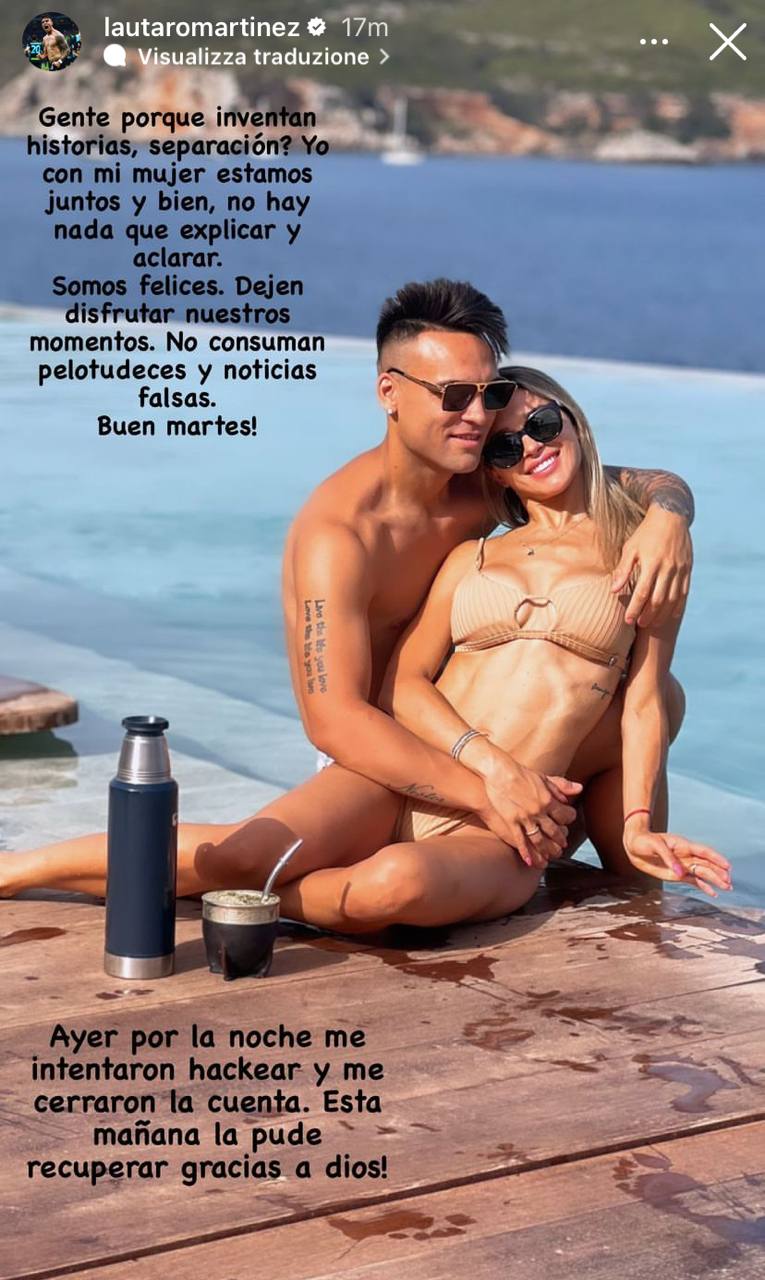 Attraverso i propri social, Lautaro Martinez ha voluto smentire le voci su una crisi con la moglie Agustina Gandolfo: “Perché vi inventate storie su una possibile separazione? Io e mia moglie stiamo insieme e stiamo bene, non c’è nulla da spiegare o da chiarire. Siamo felici, vogliamo goderci i nostri momenti insieme. Non date retta alle sciocchezze a alle falsità. Ieri notte mi hanno hackerato e chiuso l’account Instagram, stamattina per fortuna sono riuscito a recuperarlo”, ha concluso il Toro”.