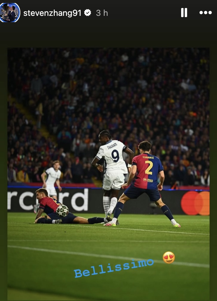 C'era anche Steven Zhang davanti al televisore come milioni di altri spettatori per assistere allo spettacolo offerta da Barcellona e Inter, che ieri si sono spartiti le posta in palio mandando in scena un 3-3 pirotecnico nella semifinale d'andata di Champions League. Tra i tanti gesti tecnici del match, l'ex presidente nerazzurro ha scelto il primo in ordine cronologico, il colpo di tacco alla Hernan Crespo con cui Marcus Thuram ha aperto le marcature dopo una manciata di secondi: "Bellissimo", ha scritto su Instagram Zhang.
