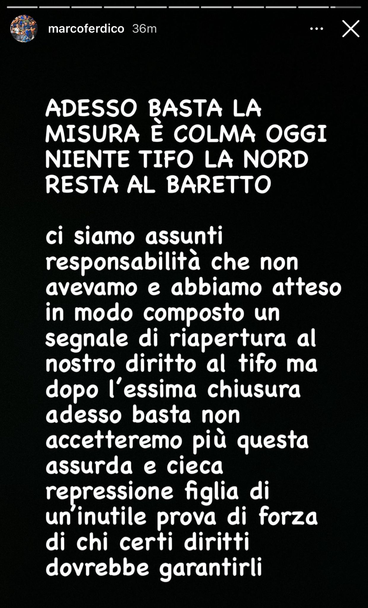 "Adesso basta. La misura è colma. Oggi niente tifo: la Nord resta al Baretto". Inizia così la comunicazione attraverso la quale Marco Ferdico, rappresentante della Curva Nord dell'Inter ha reso nota la decisione vagliata dall'intera curva nerazzurra in occasione di Inter-Genoa. "Ci siamo assunti responsabilità che non avevamo e abbiamo atteso in modo composto un segnale di riapertura al nostro diritto al tifo, ma dopo l'ennesima chiusura, adesso basta. Non accetteremo più questa assurda e cieca repressione figlia di un'inutile prova di forza di chi certi diritti dovrebbe garantirli" si legge nella storia Instagram pubblicata da Ferdico e dai canali ufficiali della Curva.