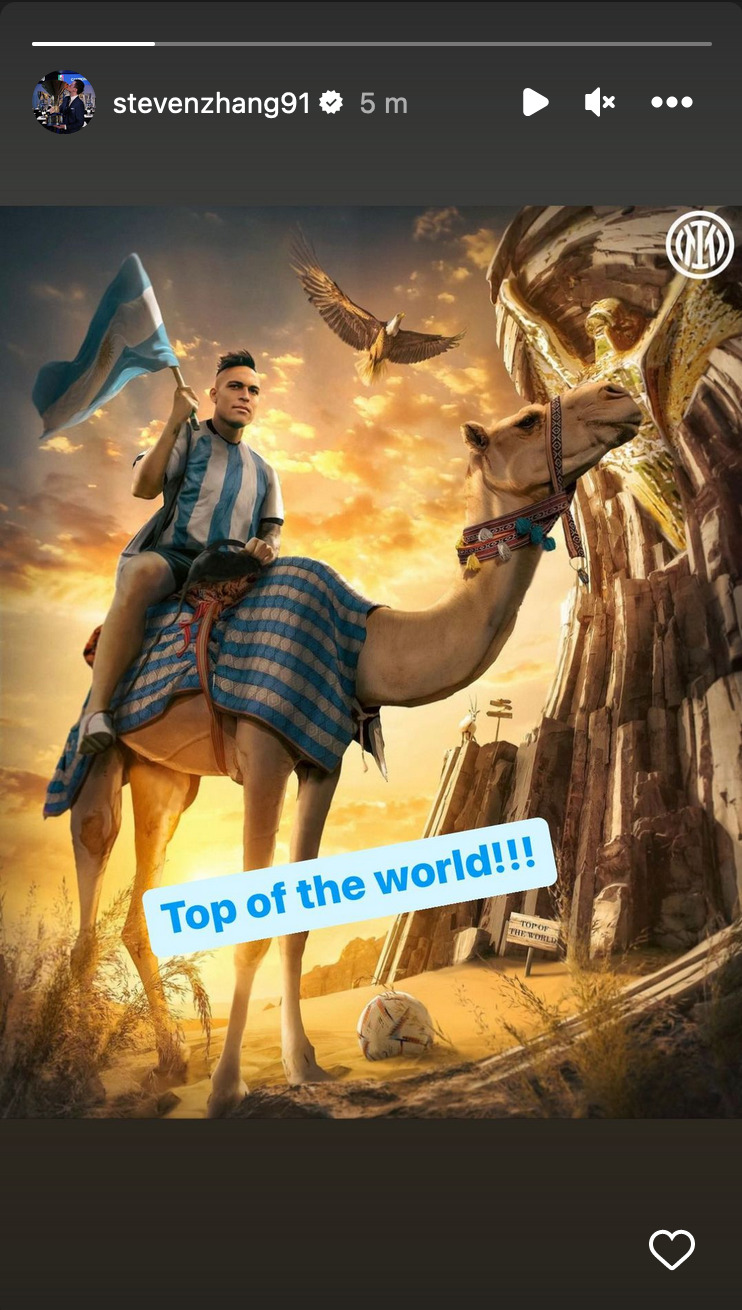 Attraverso i propri social, il presidente dell’Inter Steven Zhang si è voluto complimentare con l’Argentina e con Lautaro Martinez, oggi vittorioso in Qatar nella finalissima Mondiale contro la Francia: “Top of the world”, scrive il magnate cinese allegando una foto del Toro in sella a un cammello.
