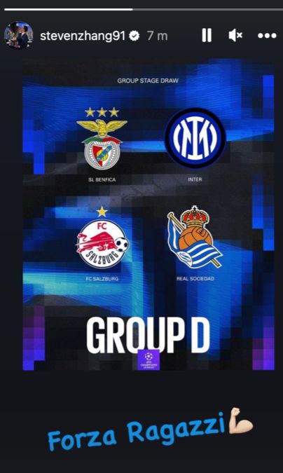 Dopo le prime due uscite in campionato, terminate entrambe con due vittorie, riparte la stagione europea dell'Inter. Le urne di Montecarlo hanno decretato le avversarie in Champions della squadra di Simone Inzaghi che dopo la finale di Istanbul riparte da Benfica, Salisburgo e Real Sociedad. Il primo ad esprimersi a proposito è il presidente Steven Zhang che affida a Instagram la sua prima incitazione alla squadra: "Forza Ragazzi" si legge in una storia Instagram del Presidente.