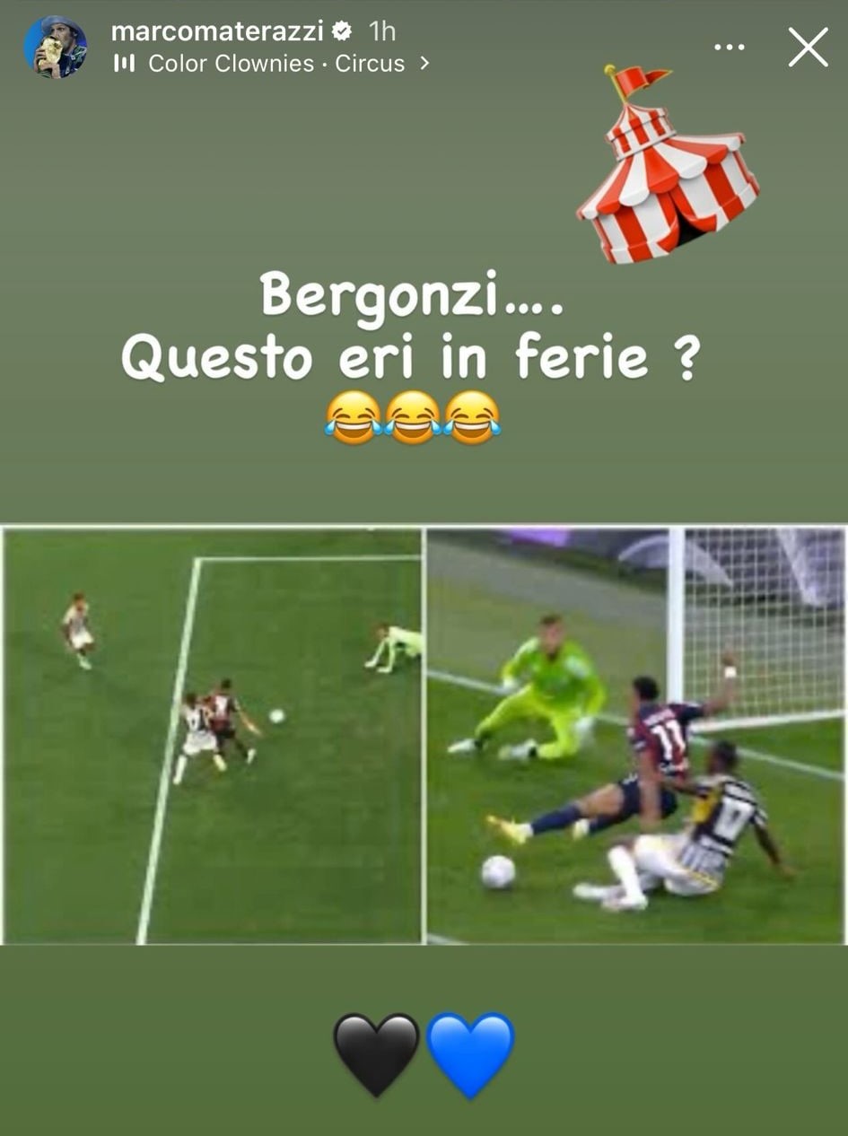 Marco Materazzi risponde per le rime all'ex arbitro Mauro Bergonzi, che quest'oggi ha definito in maniera un po' azzardata "l'errore più grave da quando esiste il VAR" il contatto in area veronese tra Alessandro Bastoni e Ondrej Duda prima del gol dell'Inter di Davide Frattesi. Dal proprio profilo Instagram, Matrix non le manda a dire all'ex direttore di gara e in generale a coloro che si sono sentiti in dovere di dire la loro per quanto avvenuto sabato: "Visto che vi sentite tutti fenomeni, da oggi siete pregati di parlare tutte le domeniche! Grazie e Forza Inter sempre", scrive Materazzi riprendendo le parole di Bergonzi che in una storia successiva viene chiamato direttamente in causa sul clamoroso rigore non concesso all'attaccante del Bologna Dan Ndoye nella gara contro la Juventus: "Questo eri in ferie?", chiede sarcastico con la colonna sonora del circo.