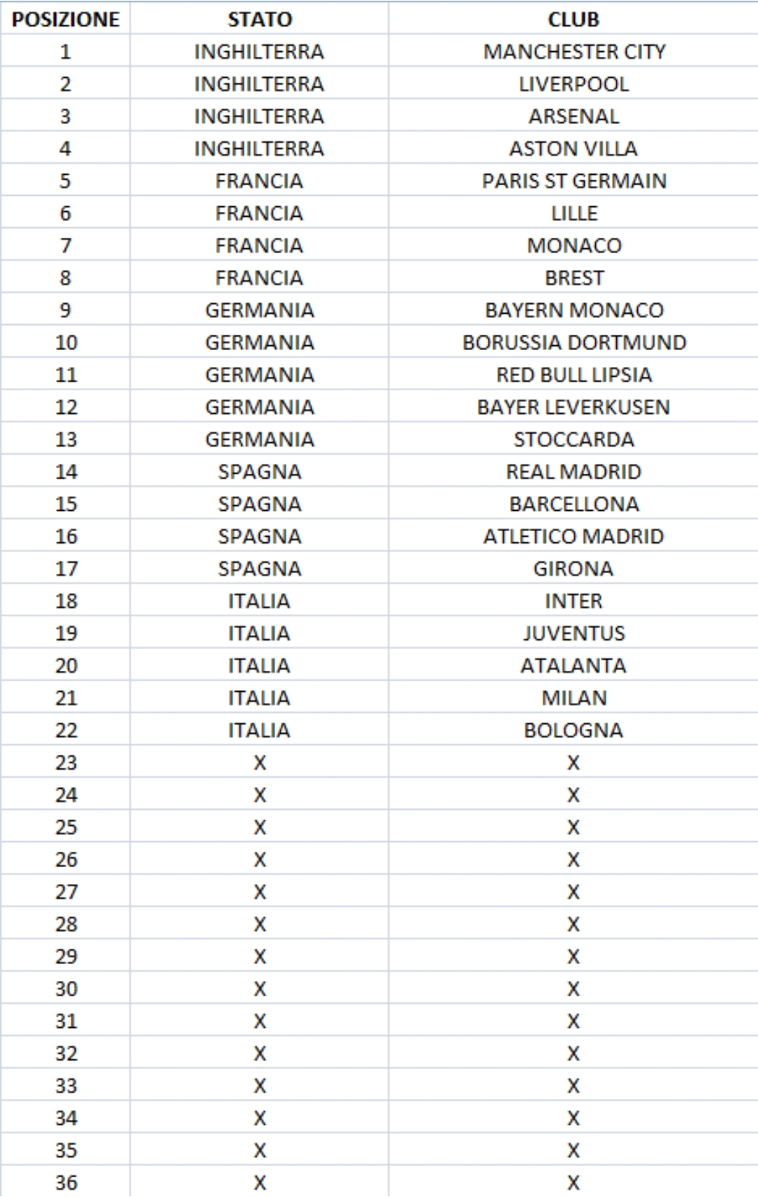 - Le Equal Shares. Sono il cosiddetto bonus di entrata, uguale per tutte e 36 le squadre che arrivano alla fase del maxi girone. Una fetta di 670.000.000 milioni di euro da dividere per 36, per una cifra destinata ad ogni singola squadra pari a 18.620.000 €. Di questi, 17.787.000 € vengono pagati il 20 settembre 2024. I rimanenti 750.000 euro la UEFA li trattiene e li versa ai club solo ad Ottobre 2025. E anche se un club incassa i soldi nella stagione 2025-2026, per principio di competenza economica vengono contati nell’arco di questa stagione.
