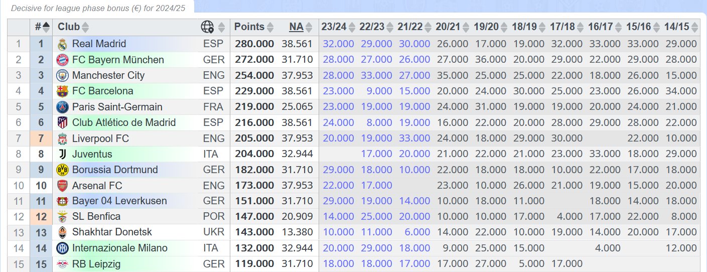 - I bonus per le prestazioni. Questo è già dal nome il criterio che fa la differenza maggiore, grazie al quale l’Inter si sta portando a casa quasi il doppio dei soldi degli altri club italiani. La logica del risultato è molto semplice: la UEFA assegna 700.000 € ad ogni punto conquistato da ciascuna squadra. In caso di pareggio, la quota non assegnata di soldi (un pareggio assegna solo 1.400.000 € contro 2.100.000 € di una vittoria), la quota non assegnata viene redistribuita tra i club in base al piazzamento. Quest'anno ci sono stati 16 pareggi nelle 8 giornate del maxi girone; questo vuol dire che sono rimasti non assegnati 11.200.000 €. Per il resto, questa è la quota toccata a ciascuno dei club italiani: