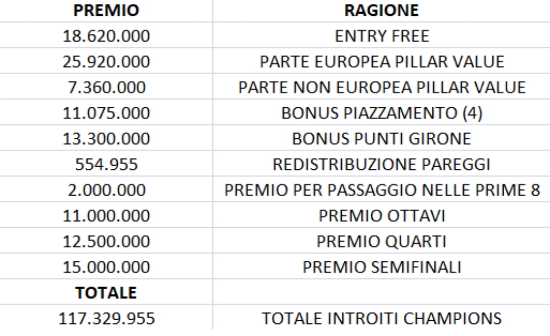 - Il Pillar Value. È il terzo e se vogliamo il più complicato dei parametri. Va suddiviso in due categorie: la parte europea, che pesa per il 75% del totale, e quella non europea che vale il 25%. La distribuzione avviene attraverso un meccanismo che si chiama ‘Sistema a Celle (lo stesso usato per i pareggi). In sostanza il valore complessivo (853.000.000) viene diviso prima in 75-25, procurando quindi: