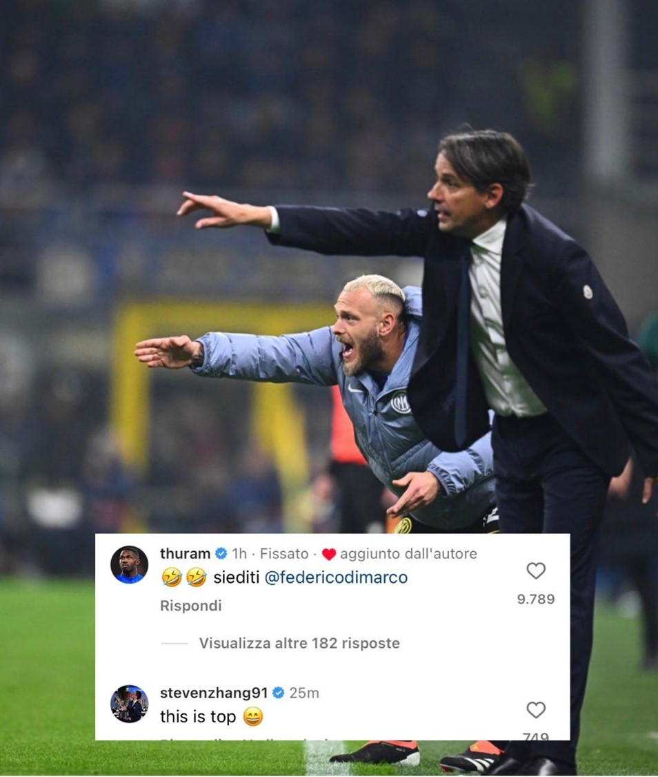 E' già diventata virale la foto che ritrae Federico Dimarco fare il 'clone' di Simone Inzaghi mentre si prodiga nel dare indicazioni da bordocampo ai compagni quasi emulando le mosse del suo allenatore. Immagine che ha scatenato inevitabilmente anche l'ilarità dei compagni di squadra, in primis Marcus Thuram che su Instagram invita il suo grande amico a sedersi. Ma tra i vari commenti c'è anche quello del presidente dell'Inter Steven Zhang, che scrive: "Questo è il top".