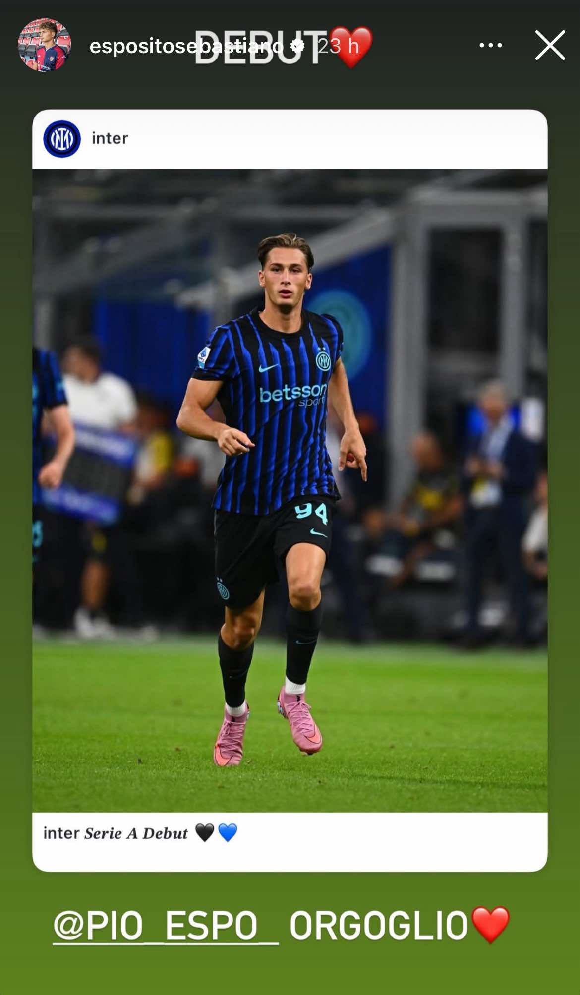 L'esordio a San Siro con la maglia dell'Inter di Francesco Pio Esposito, coinciso con la sconfitta contro l'Udinese, fa gonfiare il petto al fratello Sebastiano, che quest'estate ha reciso il cordone ombelicale che lo legava ai nerazzurri approdando al Cagliari a titolo definitivo: "Orgoglio", ha scritto Seba su Instagram, a corredo della foto che ritrae l'ex giocatore dello Spezia calcare il magico prato della Scala del Calcio con indosso la maglia dei suoi sogni.