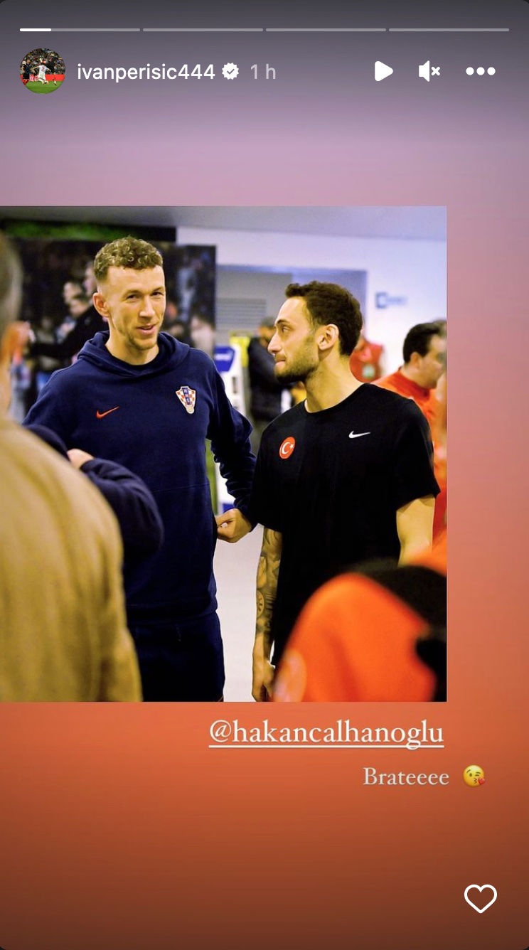 Turchia e Croazia si affronteranno domani nella seconda giornata del girone D di qualificazione a Euro 2024. E sarà l'occasione per Hakan Calhanoglu per ritrovare un vecchio amico, l'ex nerazzurro Ivan Perisic che in estate si è trasferito al Tottenham da svincolato. I due si sono già incontrati e salutati oggi, come testimoniato da una storia Instagram del croato: "Fratello", si legge.