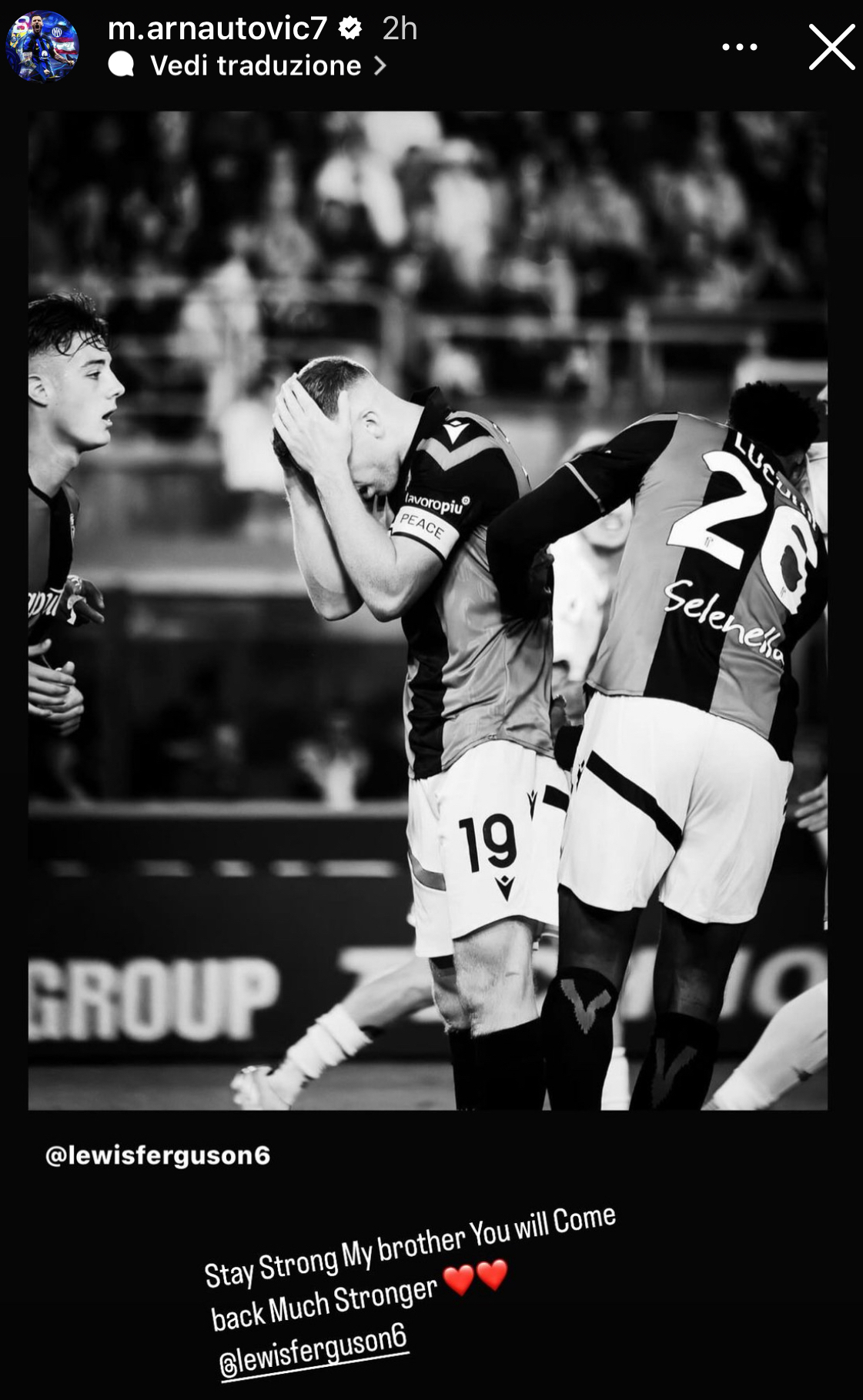 Stagione finita per il giocatore del Bologna Ferguson, reduce dalla rottura del legamento crociato del ginocchio destro rimediato sabato scorso nel match contro il Monza. In sostegno dell'ex compagno arriva la dedica dell'ex rossoblu, oggi attaccante dell'Inter, Marko Arnautovic che su Instagram rivolge un pensiero allo scozzese: "Sii forte fratello, tornerai più forte di prima".