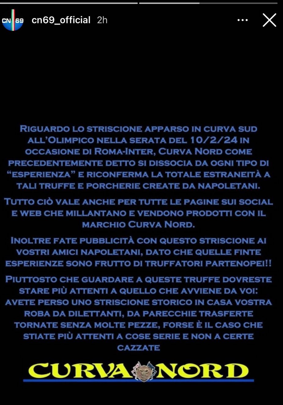 Dopo lo striscione provocatorio comparso all'Olimpico durante Roma-Inter dello scorso 10 febbraio, la Curva dell'Inter chiarisce l'estraneità dei fatti a quanto asserito dai tifosi giallorossi tramite lo striscione esposto: "Riguardo lo striscione apparso in curva sud all’Olimpico nella serata del 10/2/24 in occasione di Roma-Inter, Curva Nord come precedentemente detto si dissocia da ogni tipo di 'esperienza' e riconferma la totale estraneità a tali truffe e porcherie create da napoletani" spiega la Nord su Instagram.