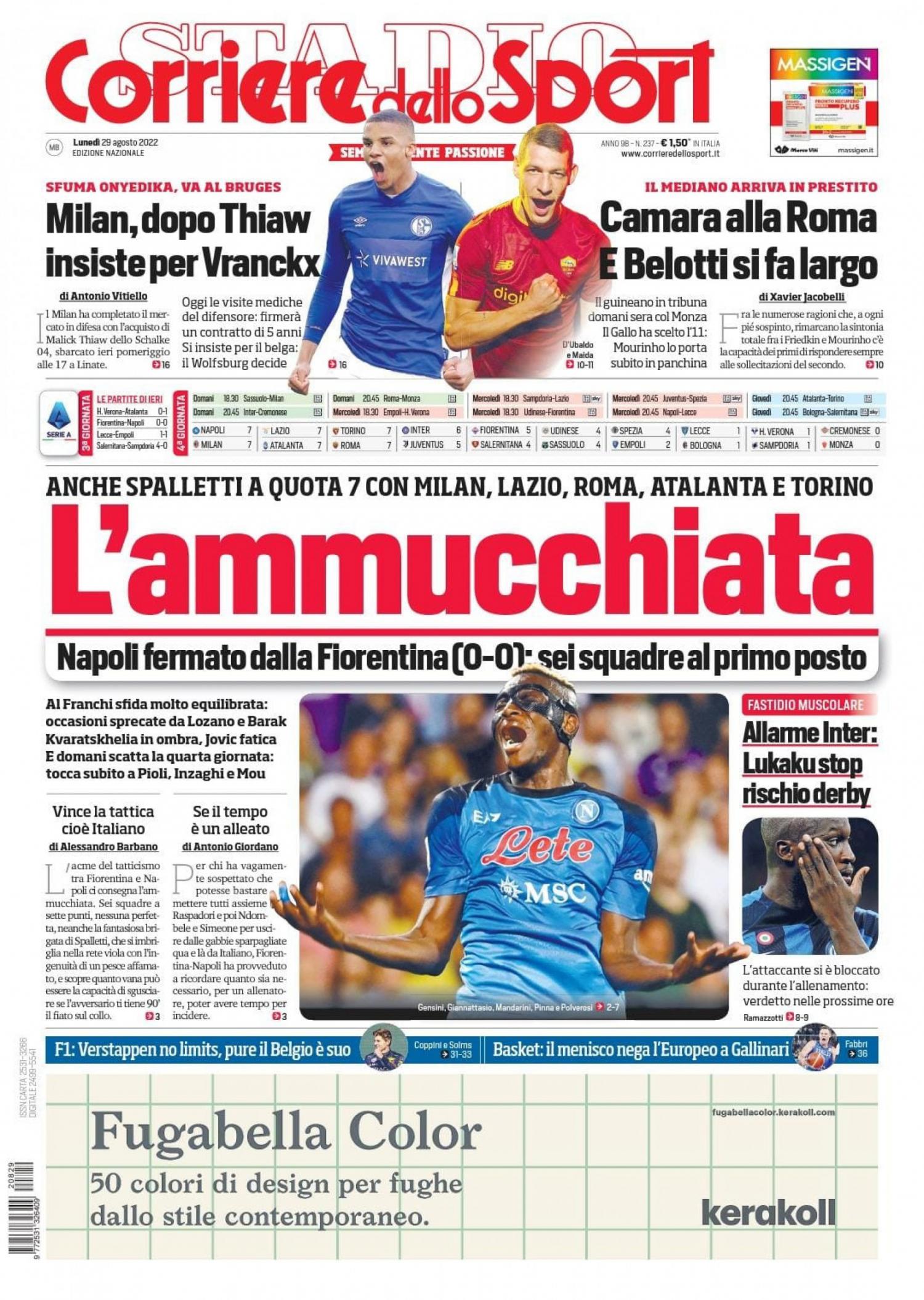 “L’ammucchiata”. Si apre così il Corriere dello Sport in edicola domani in riferimento alle sette formazioni in vetta. Spazio però anche all’Inter in taglio laterale: “Allarme Inter: Lukaku stop, rischio derby”.