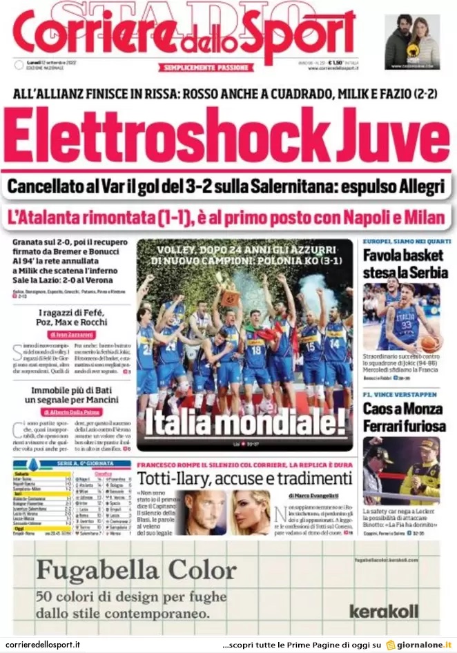 “Elettroshock Juve”. Si apre così la prima pagina del Corriere dello Sport in edicola domani. “Cancellato al VAR il gol del 3-2 sulla Salernitana: espulso Allegri. All’Allianz finisce in rissa: rosso anche a Cuadrado, Milik e Fazio”. E ancora: “L’Atalanta rimontata (1-1), è al primo posto con Napoli e Milan”.