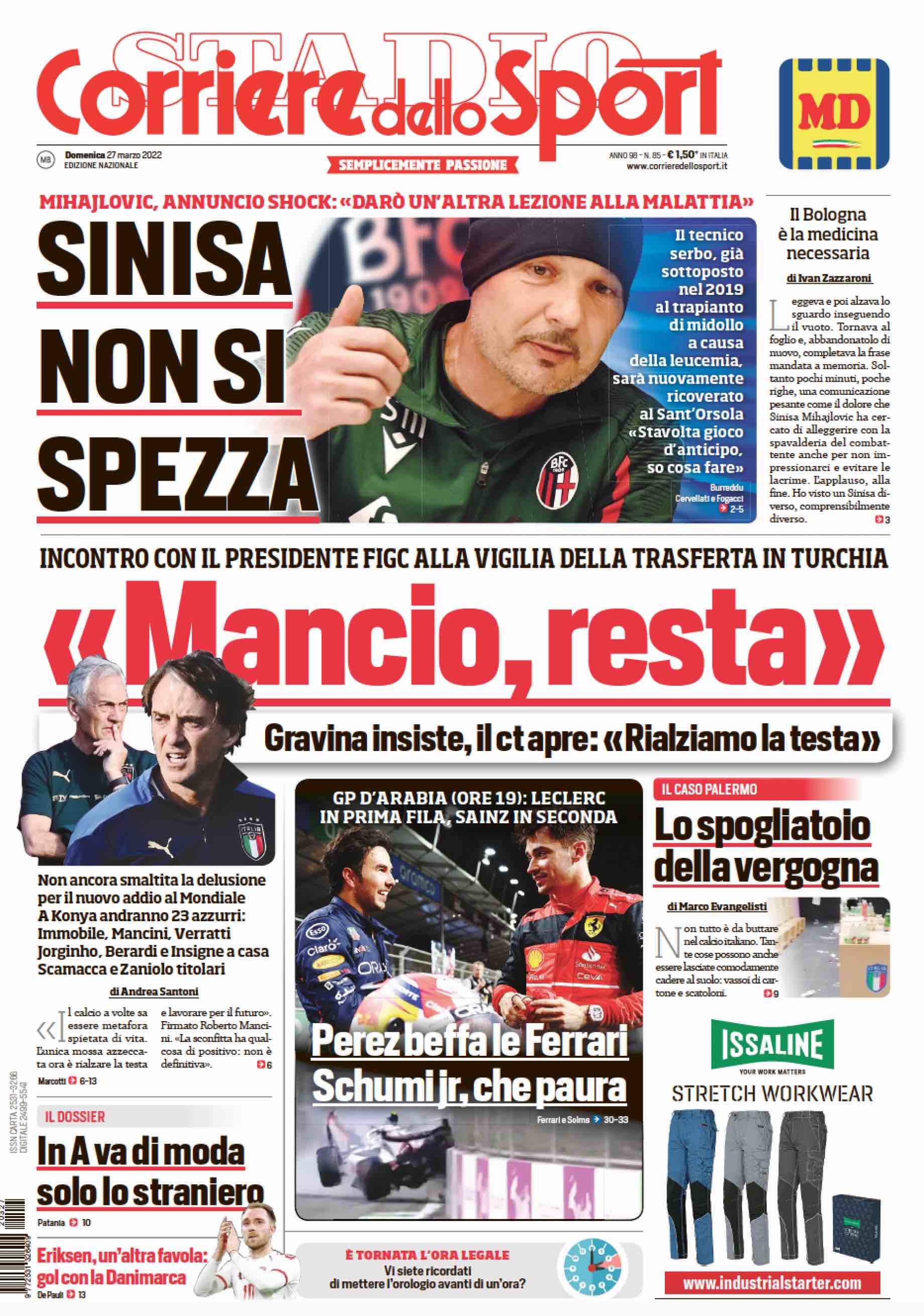 Tanti temi sulla prima pagina del Corriere dello Sport in edicola domani. Il quotidiano apre con il futuro di Roberto Mancini “Mancio, resta. Incontro con il presidente FIGC alla vigilia della trasferta in Turchia. Gravina insiste, il ct apre ‘Rialziamo la testa’”. Spazio anche a Sinisa Mihajlovic: “Sinisa non si spezza. Mihajlovic, annuncio shock: ‘Darò un’altra lezione alla malattia’”. Spazio anche al ritorno al gol di Christian Eriksen: “Un’altra favola, gol con la Danimarca”.