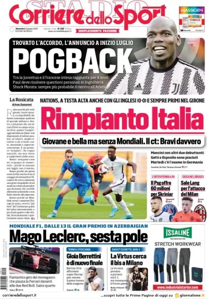 "Il PSG offre 60 mln per Skriniar, l'Inter ferma a 80". Si apre così la prima pagina del Corriere dello Sport. Titolo principale dedicato all’Italia dopo lo 0-0 contro l’Inghilterra.