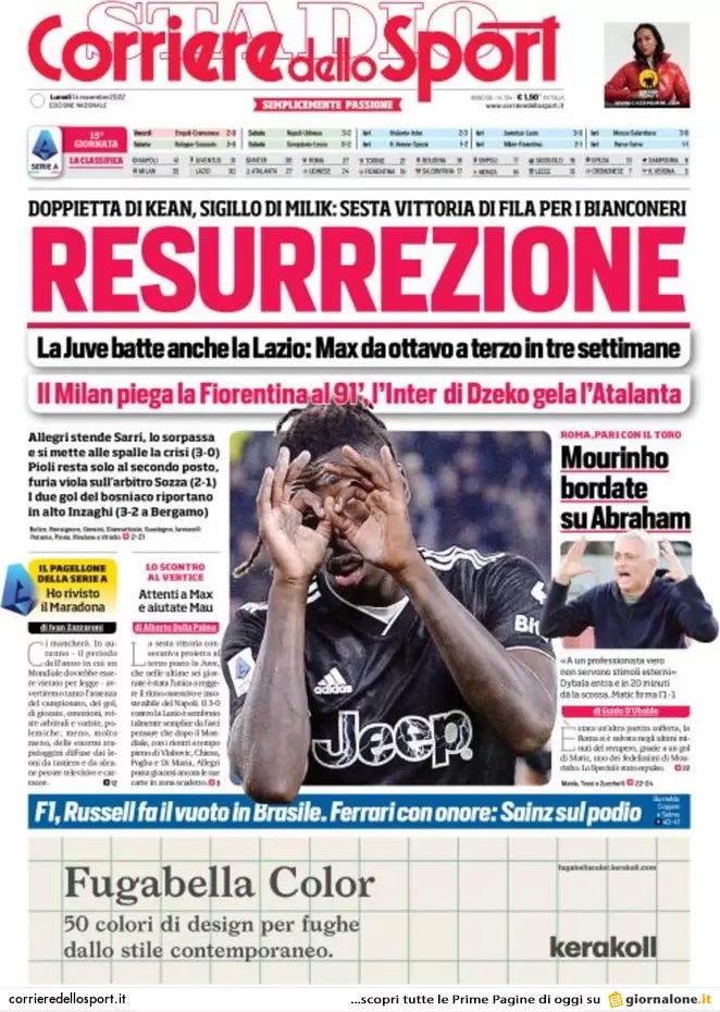 “Resurrezione”. Si apre così la prima pagina del Corriere dello Sport con riferimento alla vittoria della Juventus. “La Juve batte anche la Lazio: Max da ottavo a terzo in tre settimane. Il Milan piega la Fiorentina al 91’, l’Inter di Dzeko gela l’Atalanta. I due gol del bosniaco riportano in alto Inzaghi (3-2 a Bergamo).