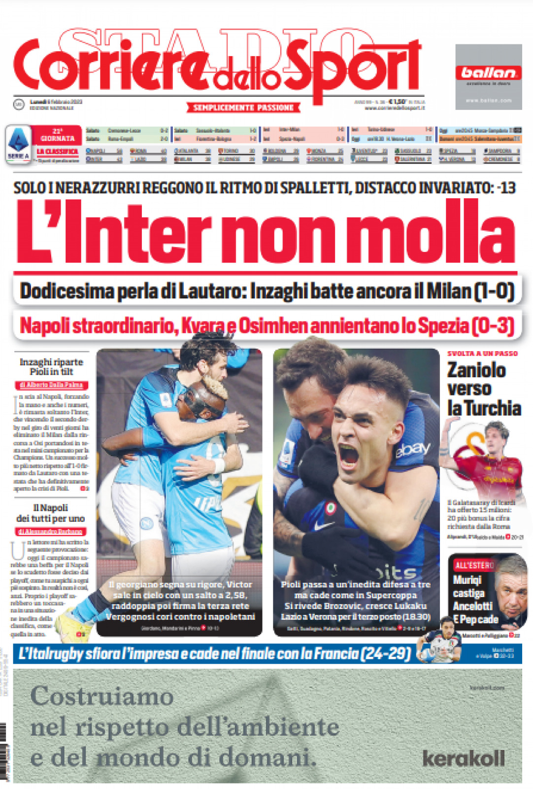 “L’Inter non molla”. Si apre così la prima pagina del Corriere dello Sport in edicola domani. “Solo i nerazzurri reggono il ritmo di Spalletti, distacco invariato: -13. Dodicesima perla di Lautaro: Inzaghi batte ancora il Milan (1-0).