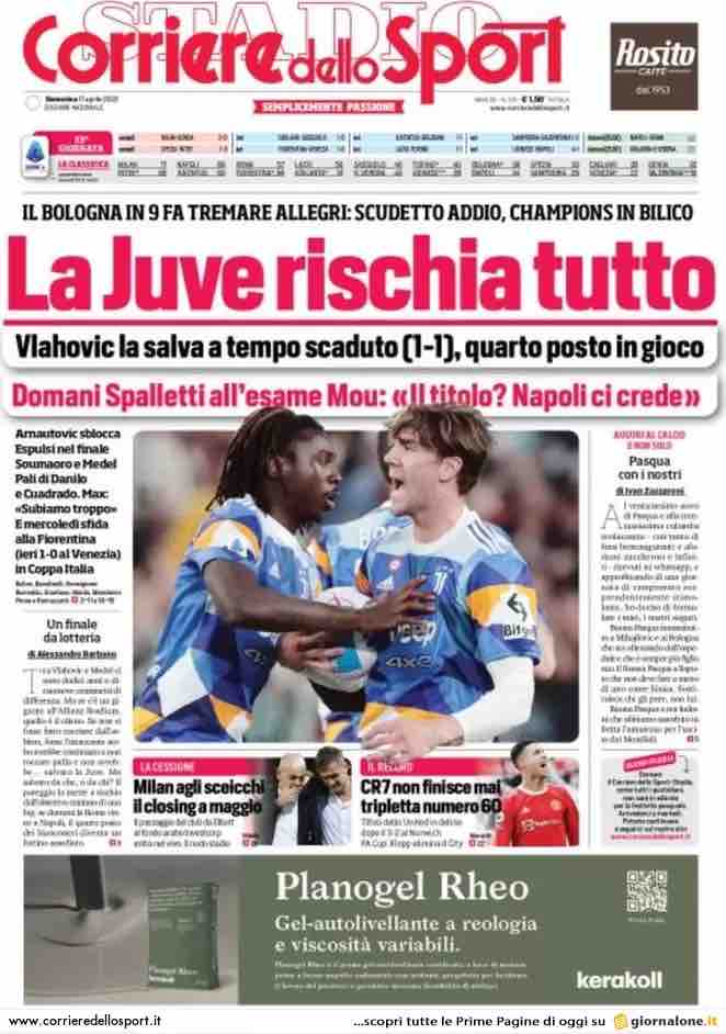 Il Corriere dello Sport dedica alla Juventus la prima pagina del quotidiano in edicola domani: “La Juve rischia tutto. Il Bologna fa tremare Allegri: Scudetto addio, Champions in bilico. Vlahovic la salva a tempo scaduto (1-1), quarto posto in gioco. Domani Spalletti all’esame Mou”.