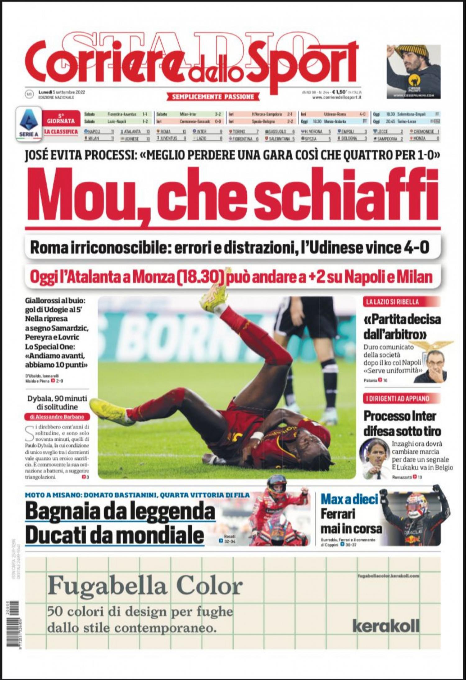 “Mou che schiaffi”, si legge sul Corriere dello Sport in edicola domani. Spazio anche all’Inter in taglio laterale: “Processo Inter, difesa sotto tiro. I dirigenti ad Appiano. Inzaghi ora dovrà cambiare marcia per dare un segnale. E Lukaku va in Belgio”.