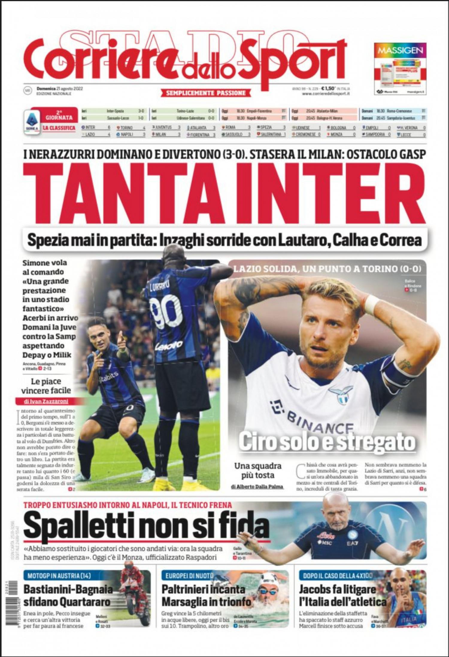 Il Corriere dello Sport in edicola domani apre così la prima pagina: “Tanta Inter. I nerazzurri dominano e divertono (3-0). Stasera il Milan: ostacolo Gasp”. E ancora: “Spezia mai in partita: Inzaghi sorride con Lautaro, Calha e Correa. Simone vola al comando. Acerbi in arrivo”.