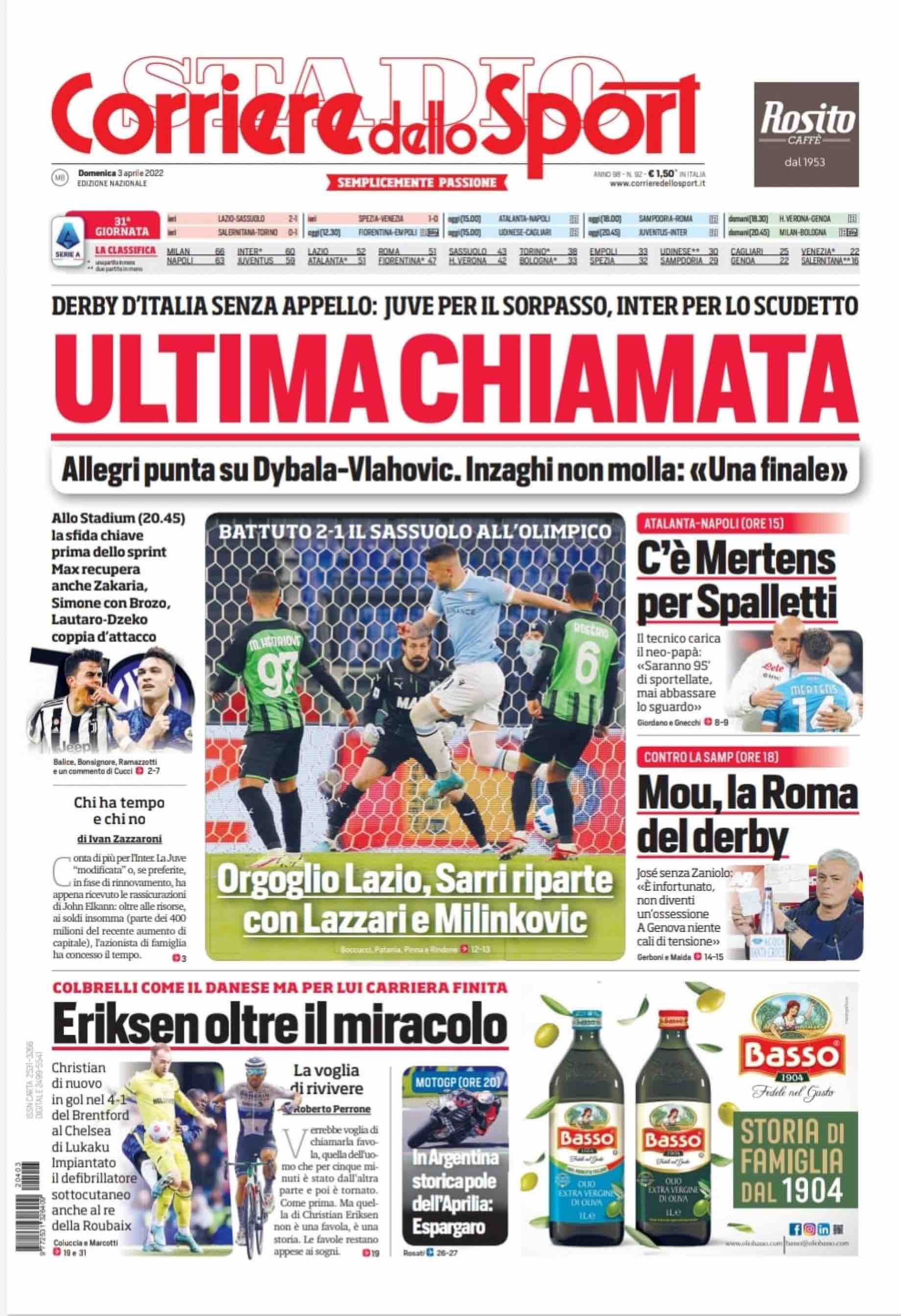 Il Corriere dello Sport apre così la prima pagina in edicola domani: "Ultima chiamata - si legge -. Derby d'Italia senza appello: Juve per il sorpasso, Inter per lo scudetto". "Allegri punta su Dybala-Vlahovic. Inzaghi non molla: 'Una finale' ". Di spalla, spazio a Napoli e Roma, che affronteranno Atalanta e Sampdoria in trasferta con un Mertens in più e uno spirito da derby in più: "C'è Mertens per Spalletti"; "Mou, la Roma del derby".