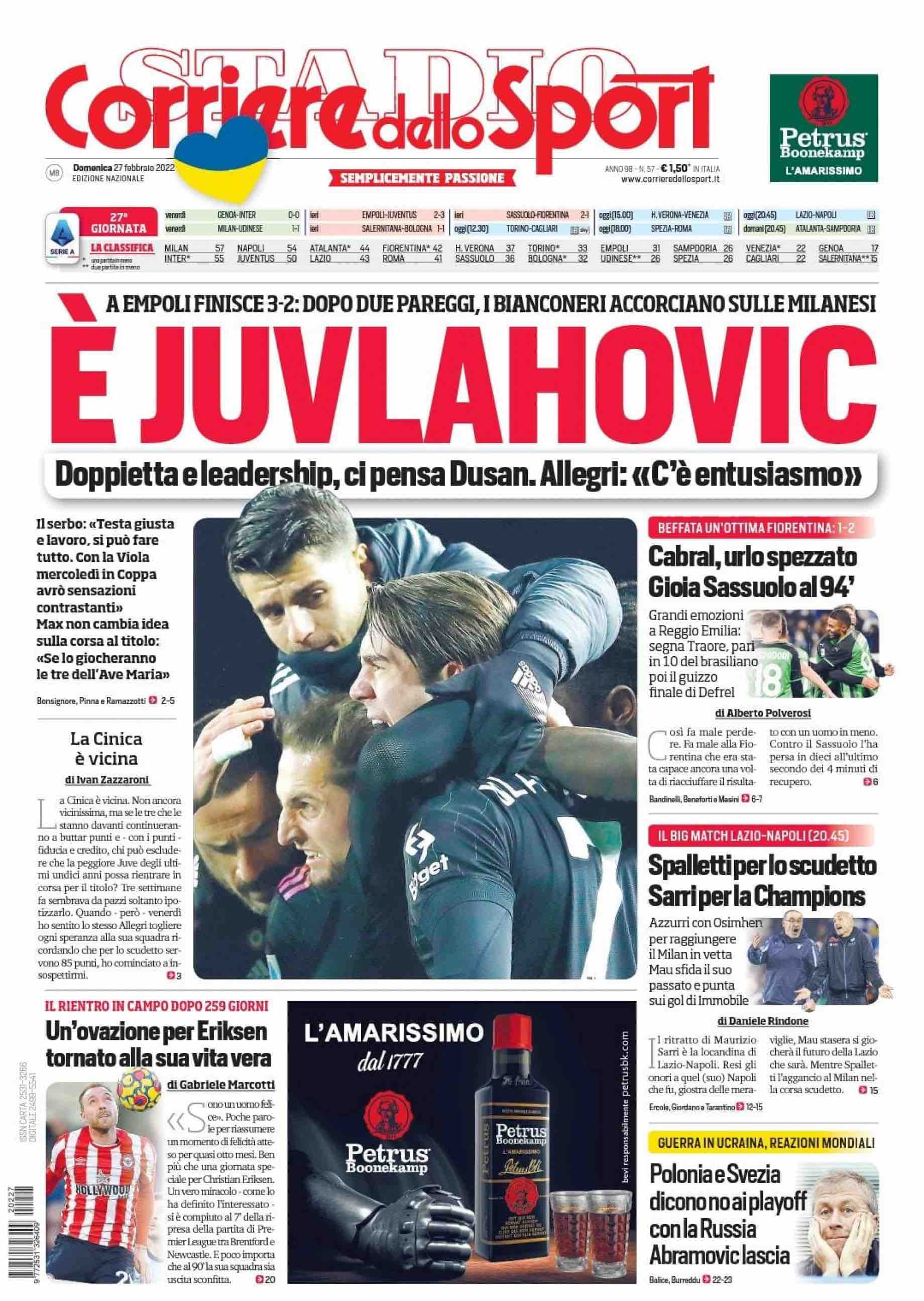 Il Corriere dello Sport apre così il quotidiano in edicola domani: “È JuVlahovic. Doppietta e leadership, ci pensa Dusan. Allegri: “C’è entusiasmo”. A Empoli finisce 3-2: dopo due pareggi, i bianconeri accorciano sulle milanesi”. Spazio anche a Eriksen: “Un’ovazione per Eriksen, tornato alla sua vita vera. Il rientro in campo dopo 259 giorni”.