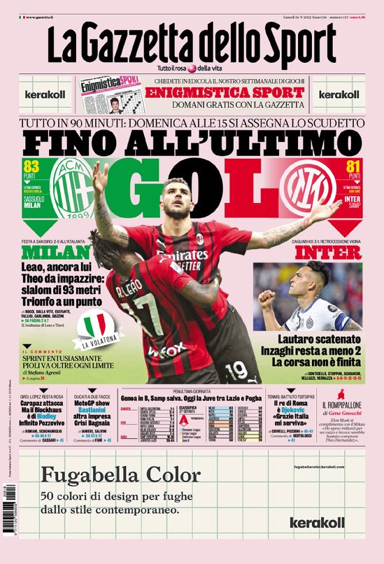 “Fino all’ultimo gol”. Si apre così la prima pagina della Gazzetta dello Sport in edicola domani. “Tutto in 90’: domenica alle 15 si assegna lo Scudetto”. Sull’Inter: “Lautaro scatenato, Inzaghi resta a -2: la corsa non è finita”.