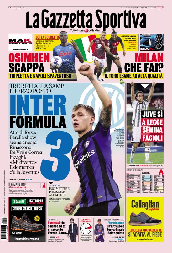 “Inter formula 3”. Apre così La Gazzetta dello Sport in edicola domani: “Tre reti alla Samp e terzo posto. Atto di forza: Barella show, segna ancora. Rinascono De Vrij e Correa. Inzaghi ‘Mi diverto’. E domenica c’è la Juventus”.