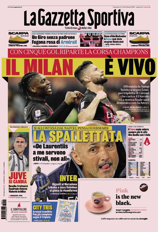 "Il Milan è vivo". Si apre così La Gazzetta dello Sport in edicola domani. "Con cinque gol riparte la corsa Champions". In basso spazio a Napoli e Inter: "La spallettata. Si allontana dal Napoli, pensa di fermarsi. Inter, giganti al Maradona. Lukaku a casa Osimhen si gioca la riconferma".
