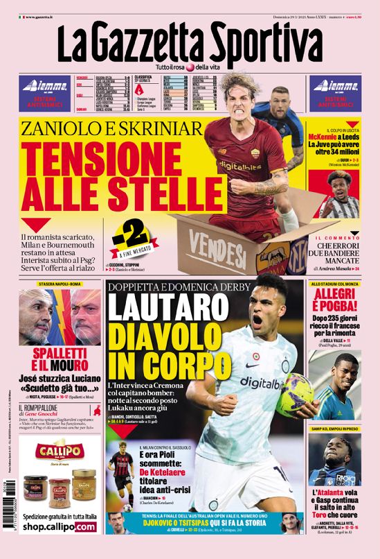 “Zaniolo e Skriniar, tensione alle stelle”. Si legge così nella prima pagina della Gazzetta dello Sport in edicola domani. “Il romanista scaricato, Milan e Bournemouth restano in attesa. Interista subito al PSG? Serve l’offerta al rialzo”. Spazio alla partita in taglio basso: “Lautaro, diavolo in corpo. Doppietta e domenica derby. L’inter vince a Cremona col capitano bomber: notte al secondo posto. Lukaku ancora giù”.