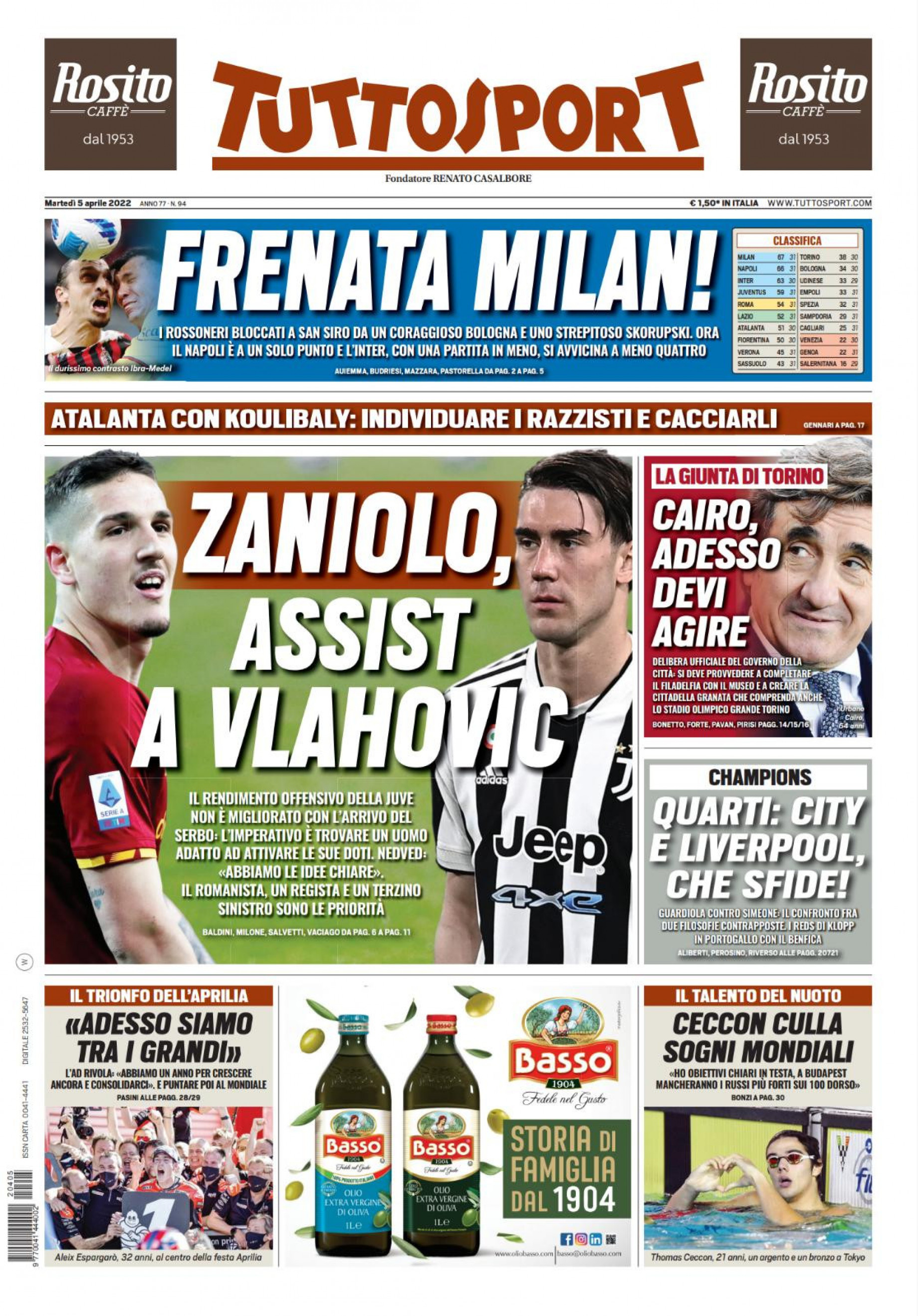 “Frenata Milan!”. Si apre così la prima pagina di Tuttosport in edicola domani: “I rossoneri bloccati a San Siro da un coraggioso Bologna e uno strepitoso Skorupski. Ora il Napoli è a un solo punto e l’Inter, con una partita in meno, si avvicina a -4”.