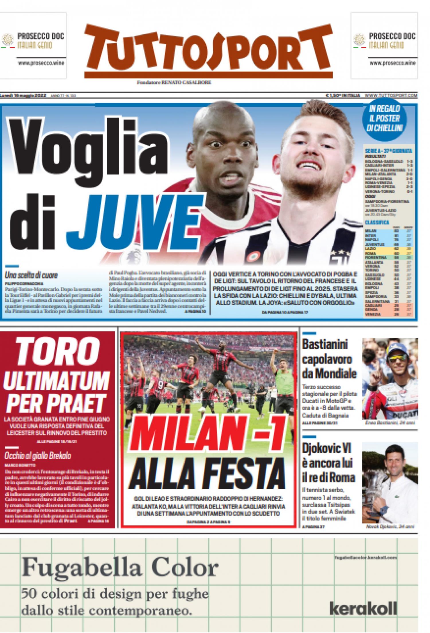 “Milan, -1 alla festa”. Si apre così la prima pagina di Tuttosport: “Gol di Leao e straordinario raddoppio di Hernandez. Atalanta ko, ma la vittoria dell’Inter a Cagliari rinvia di una settimana l’appuntamento con lo Scudetto”.