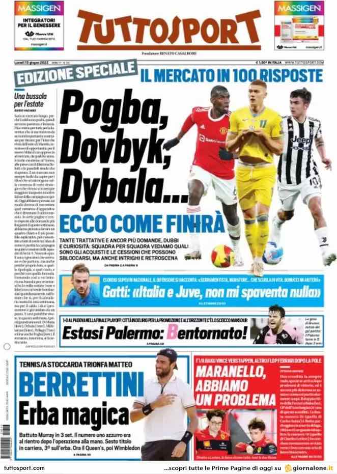 “Pogba, Dovbyk, Dybala… ecco come finirà”. Si apre così la prima pagina di Tuttosport in edicola domani. “Tante trattative e ancor più domande, dubbi e curiosità: squadra per squadra vediamo quali sono gli acquisti e le cessioni che possono sbloccarsi, ma anche intrighi e retroscena”.