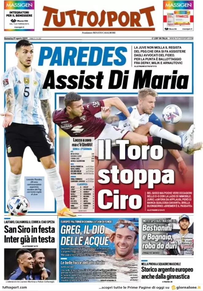 “San Siro in festa, Inter già in testa”. Si apre così la prima pagina di Tuttosport in taglio basso: “Lautaro, Calhanoglu, Correa: ciao Spezia”, si legge.
